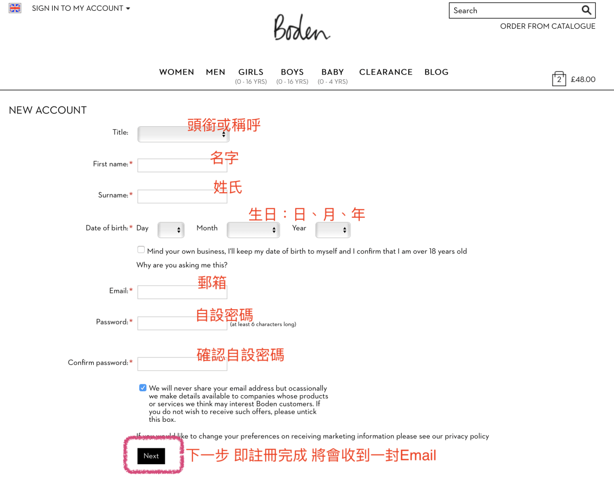 點選 Register here 之後即進入填寫會員資料的頁面,一一填入後即完成註冊,之後就可以開始選購商品了!