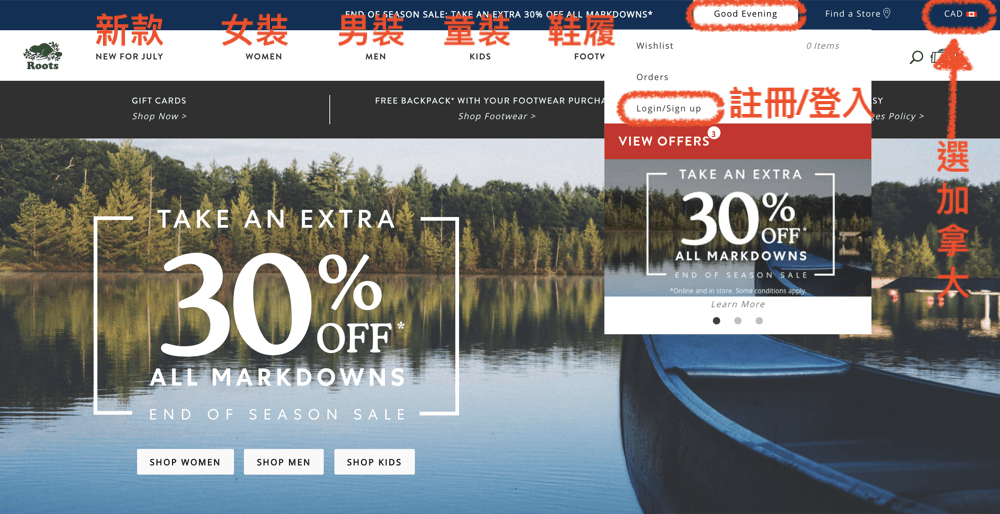註冊會員時,打開 Roots 官網 (http://bit.ly/2Og9i9k) 後,不管是人在哪個國家為了避免國別跳走,請確認右上角的小國旗是加拿大國旗,簡稱 CAD 才會是甜甜的加幣價格喔!!!(幣別很重要喔!繼續看下去你就知道有多重要^^)